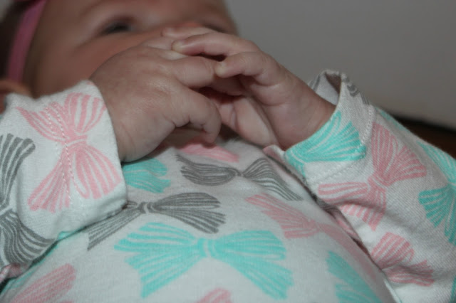 -Still likes to suck on her hands. She has figured out how to suck her thumb; we've had to start putting gloves on.